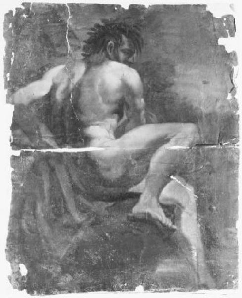 Uomo nudo, Ulisse o Achille (?), a figura intera, seduto di schiena su un drappo, il ginocchio destro piegato, il capo coronato di fronde; su fondo di alberi.