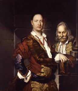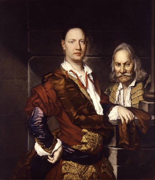 - NOTIZIE STORICO CRITICHE L'opera, pervenuta in Accademia Carrara con il legato testamentario di Giovanni Secco Suardo del 1871, è tra i più celebri ritratti di Fra' Galgario per la freschezza dell'invenzione e per l'interpretazione data da una parte della critica, e in particolare da Giovanni Testori, che vi ha visto quello stesso spirito di "denuncia sociale" che fu di Giacomo Ceruti, detto appunto il Pitocchetto. Più che intenti sociologici, tuttavia, Francesco Rossi ha colto nell'"arrogante stupidità del nobiluomo en deshabillé e [nel]la rassegnata vecchiaia del servo" l'efficace espressione dello "spregiudicato naturalismo ghislandiano" (2004). Giovanni Secco Suardo, nato nel 1678 e qui raffigurato all'eta approssimativa di quarant'anni, era il figlio di Girolamo, ritratto in grande pompa dallo stesso Ghislandi nel 1711 (Accademia Carrara, inv. 58AC00108). Giovanni è rappresentato in modo informale con la testa rasata (priva di parrucca) e con la camicia slacciata, così come è aperta in modo trasandato quella che spunta sotto la livrea del domestico: entrambi i personaggi appaiono in una dimensione domestica e privata, dove non è necessario rispettare rigorosamente l'etichetta. Raffinati signori eternati in veste da camera o in abbigliamento 'comodo' nell'intimità della propria dimora sono comunque quasi un 'topos' nei ritratti di Fra' Galgario e della sua scuola. La posa di Giovanni Secco Suardo ricalca quella nel "Ritratto di gentiluomo", già Visconti Venosta, ora a Raleigh, e questa ripetizione potrebbe imputarsi all'utilizzo da parte del frate, tramandato dal Tassi, di "una figura di legno quanto il vivo, la quale nelle giunture tutta snodata essendo, volgeva e atteggiava a proprio piacimento". Il ductus pittorico è veloce e immediato, le pennellate larghe e a piccoli tocchi che restituiscono la qualità materica degli oggetti, tuttavia la composizione, in questa fase intermedia dell'attività di Fra' Galgario, è ancora studiata e costruita, diversamente dalla fase tarda, quando dominerà la resa 'naturale' e immediata del personaggio.
