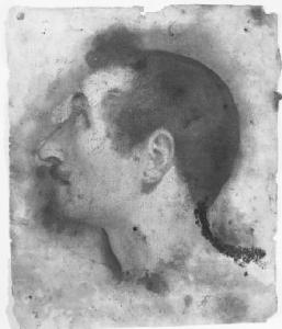 Testa di uomo giovane, con barba (pizzo), di profilo.