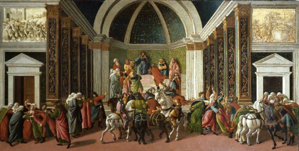 - NOTIZIE STORICO CRITICHE Si tratta probabilmente del pannello della di una spalliera di Palazzo Vespucci. Oggetti collegati: Storie di Lucrezia (Boston, Stewart Gardner Museum). La scritta al verso di grandi dimensioni risalirebbe al XIX secolo. La firma indecifrabile risale al XIX secolo. 1550 Vasari Giorgio: "Nella via de' Servi in casa Giovanni Vespucci, hoggi di Piero Salviati, fece intorno una camera molti quadri chiusi da ornamenti di noce per ricingimento & spalliera, con molte figure, & vivissime, & belle". La cornice in legno modanato e dorato risale al XX secolo. Giovanni Melli acquistò l'opera e Giovanni Morelli l'ereditò.