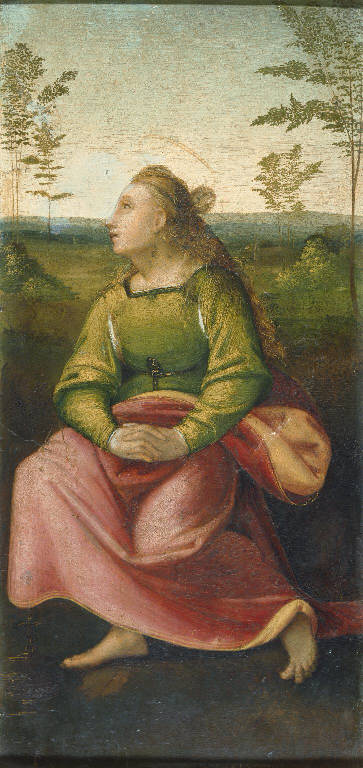 - NOTIZIE STORICO CRITICHE Potrebbe trattarsi dello scomparto di un trittico oppure essere il frammento di composizione più ampia, che prevedeva al centro una reliquia o un oggetto di devozione, in origine era collocato a destra. Oggetti collegati: San Giovanni Evangelista (Bergamo, Accademia Carrara). L'attribuzione all'Albertinelli è incerta, Rossi la mantiene sottolienda il fatto che non si conoscono ancora i suoi allievi e fa l'esempio della fase fiorentina di Innocenzo da Imola, che dopo il passaggio nella bottega dell'Albertinelli si avvicinò a Raffaello. L'iscrizione al verso a matita risale al secolo XIX. La cornice risale al secolo XX ed è in listello ligneo (cassetto con vetro).