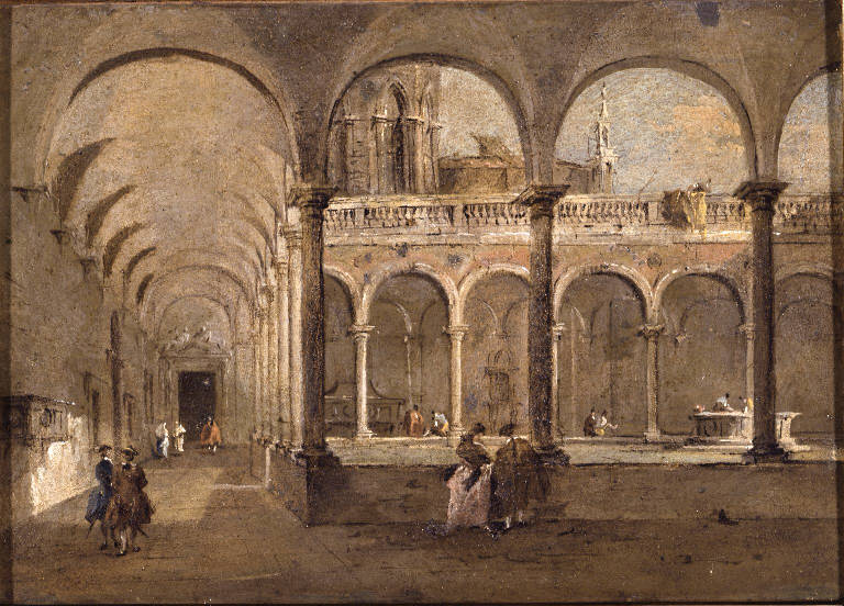 - NOTIZIE STORICO CRITICHE Opera pervenuta in Accademia Carrara con legato Francesco Baglioni del 1900. Fa parte di pendant raffigurante "Portici veneziani". Oggetti collegati: "Veduta di un portico sul lago" (58AC00147). Succi (1988), dopo un attento esame della coppia dei due capricci, è propenso a sostenere che l'opera in esame, meglio costruita e più articolata dal punto di vista architettonico rispetto all'opera in pendant, sia molto probabilmente un lavoro di Francesco Guardi.