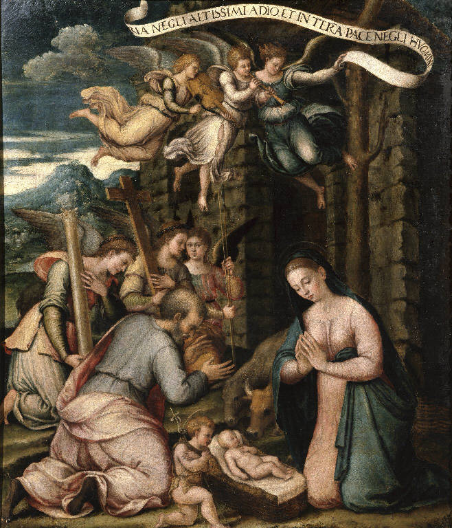 Adorazione di Gesù Bambino con San Giovannino e angeli con strumenti della passione