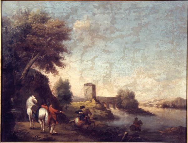 Paesaggio con cavalieri che attraversano un fiume