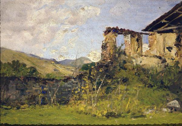 Paesaggio montano con baita diroccata
