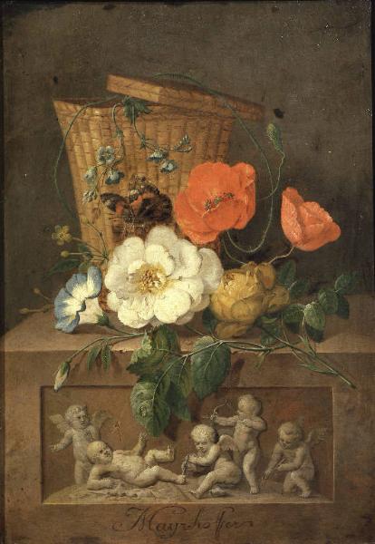 Natura morta con fiori, farfalla e canestro su basamento scolpito