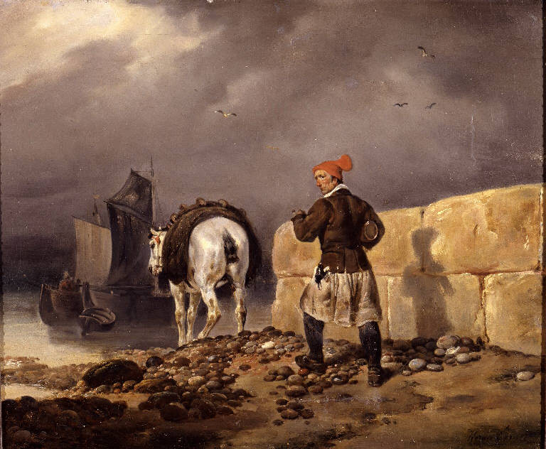 Marina con pescatore, cavallo e barche