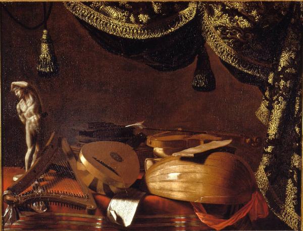 - NOTIZIE STORICO CRITICHE Andrea Marenzi ereditò l'opera prima del 1891dai parenti Secco Suardo e la lasciò in eredità a Giovanni Giacomo Marenzi; il dipinto, quindi, passò a Giulio e da lui a Giovanni che la donò alla Carrara, lasciandola in usufrutto per alcuni anni alla moglie Isabella Delmati Marenzi. L'opera è in pendant con una "Cucina", oggi in collezione privata a Torbiato: insieme costituiscono un raro esempio di "Cucina" e "Strumenti musicali" e documentano le correlazioni sia iconografiche che compositive tra le i due differenti tipi di nature morte. La scena, inquadrata da un tendaggio, dall'aspetto di un sipario, presenta da sinistra a destra, su un tavolo coperto da una tovaglia rossa, una statuetta virile, un'arpa, una mandola appoggiata su un cofanetto, uno spartito per musica vocale con testo casuale e quattro pentagrammi invece di sei, un liuto attiorbato con sopra un libricino e un violino su alcuni libri. La disposizione degli oggetti è regolata secondo rapporti geometrici sottolineati anche cromaticamente: ad esempio alcuni punti di luce bianca (la penna che spunta dal cofanetto, lo sparito, il libricino e la statuetta) sono ai vertici di uno schema romboidale, mentre il caldo colore dei legni dona raffinatezza all'insieme. L'opera è stata interpretata anche come "Vanità delle Arti Liberali", con riferimento agli strumenti (la musica), ai libri e al calamaio con penna (la poesia) e alla statuetta (le arti figurative). L'opera è databile tra il sesto e il settimo decennio, "agli esordi della fase cosiddetta barocca e più ornata, che sarà di esempio a Bartolomeo Bettera" (E. De Pascale, in "Evaristo Baschenis e la natura morta in Europa", 1996, p. 156). La cornice risale al 1950. \nIl dipinto, che è considerato uno dei capolavori del Baschenis, ha strette correlazioni con il dipinto con "Strumenti musicali", eseguito dallo stesso Evaristo e conservata a Rotterdam nel Boymans-van Beuningen Museum). Di esso sono note, inoltre, una dozzina di repliche con varianti, attribuite alla bottega e al Maestro "B. B.", che si trovano nella Galerie Morgan di Stoccolma (bottega di Baschenis Evaristo), in collezione privata a Bergamo ( Evaristo Baschenis), nella collezione Tencalla a Bissone (bottega di Evarist Baschenis), in collezione privata a Bergamo (cerchia di Evaristo Baschenis), al Museum of Fine Art di Boston (ambito bergamasco), in collezione Colleoni a Marne (ambito bergamasco), in collezione privata a Monza (bottega di Evaristo Baschenis), in collezione Gelmini a Gromo (BG) (ambito bergamasco) e in collezione Mascheretti a Pedrengo (BG) (ambito bergamasco).