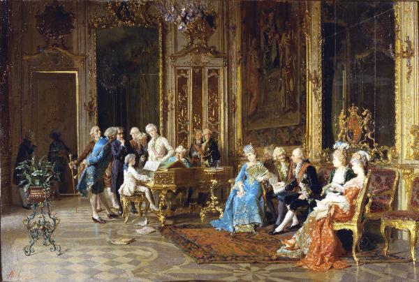 - NOTIZIE STORICO CRITICHE Cornice originale.\nUna composizione simile di Mantegazza Giacomo è conservata in Gran Bretagna (?) ("Mozart fanciullo alla corte di Giorgio III", tela).