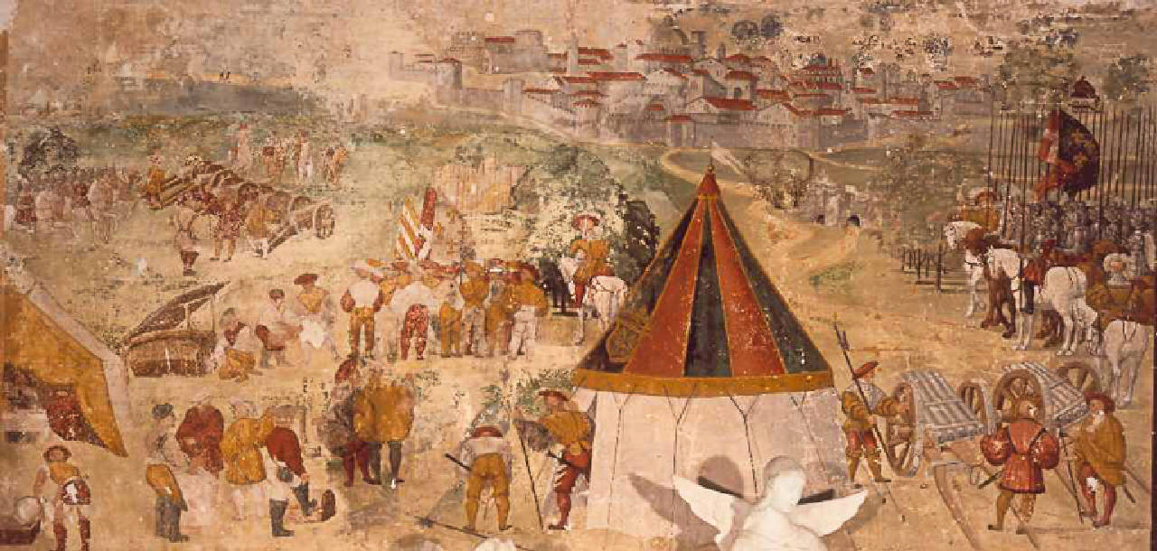 - NOTIZIE STORICO CRITICHE Si tratta di uno dei quattro frammenti di affresco raffiguranti scene di battaglie strappati abusivamente dal pittore Giovanni Cugini nel 1928 dal mutilo Castello di Telgate. Recuperati e requisiti, furono assegnati in deposito all'Accademia Carrara, che li lasciò in custodia al Luogo Pio Colleoni come testimonianza di battaglie rinascimentali nella bergamasca. Furono eseguiti nella prima metà del Cinquecento probabilmente per volere della famiglia Marenzi, che ebbe in feudo il Castello di Telgate dal 1387. Rappresentano una "Scena con fanteria in marcia" (num. inv. 58ACDP028), una "Scena con cavalleria all'attacco" (num. inv. 58ACDP029), l' "Assedio di una città fortificata", forse Bergamo, (num. inv. 58ACDP025) e una "Scena di battaglia" (num. inv. 58ACDP024). I fatti narrati potrebbero riferirsi alla Guerra della Lega di Cambrai, uno dei maggiori conflitti del Rinascimento italiano, scatenato senza successo dai principali stati europei tra il 1509 e il 1516 per arrestare la potenza della Repubblica di Venezia in terraferma.