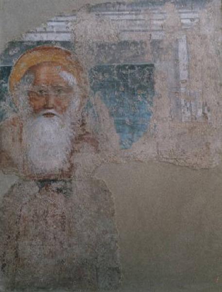- NOTIZIE STORICO CRITICHE Della decorazione ad affresco della chiesa di S. Antonio in Foris si conservano diciassette dipinti trasportati su tela con supporto rigido, ed uno in loco, nella lunetta del portale laterale murato della ex chiesa. Il dipinto in esame, strappato nel 1955 e donato al Comune di Bergamo dal Sig. Bonimi nello stesso anno, è stato depositato all'Accademia Carrara nel 1985. Ora si trova in deposito presso il Palazzo della Ragione, Sala delle Capriate insieme ad altri nove affreschi ("Madonna del Latte e Santa", "Sante", "Cristo", "Santo diacono con libro", "San Bartolomeo", "Natività di Gesù", "Sant'Antonio Abate", "Madonna con Bambino in trono e Sant'Antonio Abate" e "Madonna con Bambino in trono con Santi e angeli"). I restanti sette dipinti ("San Giovanni Battista", "Testa di Santo barbuto", "Testa di Santo", "Fregio", "Figura con manto panneggiato", "Santo (?)" e "Fregio") si trovano ancora all'Accademia Carrara.