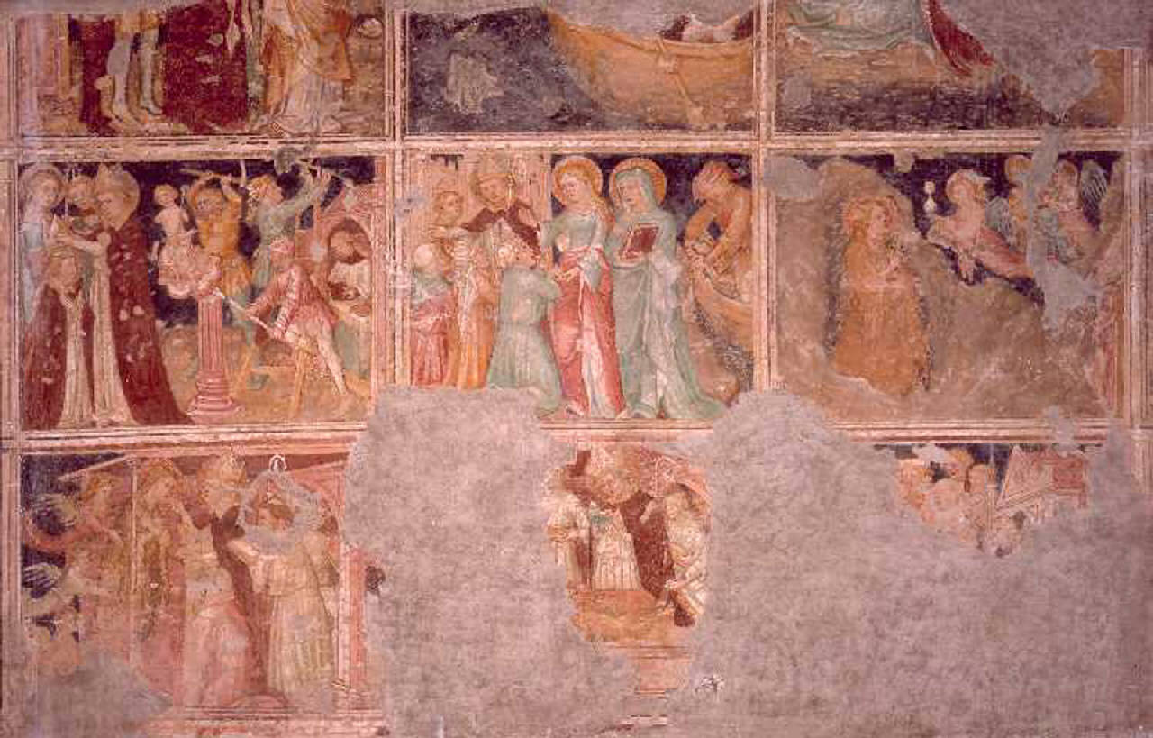 - NOTIZIE STORICO CRITICHE Gli affreschi furono staccati nel 1953 dalle pareti del coro della chiesa sconsacrata di S. Maria Maddalena in Bergamo e riportati su tela fissata su telaio ligneo parchettato. Depositati inizialmente in Accademia Carrara, dal 1991 si trovano in deposito presso il Palazzo della Ragione, Sala delle Capriate. Il ciclo è oggi coservato in due frammenti. Il primo rappresenta sei scene disposte su due registri, di cui quello superiore gravemente lacunoso; mentre del secondo qui schedato, che raggruppa nove riquadri su tre file, il registro superiore è assai danneggiato.