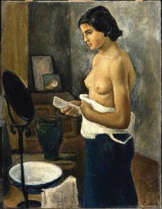 - NOTIZIE STORICO CRITICHE Allievo di Contardo Barbieri. Questa tela precede cronologicamente di tre anni il nudo 58EL00066 e rivela infatti una pratica ancora acerba della costruzione della scena. Il Locati disperde la propria attenzione nella descrizione degli elementi che connotano la stanza, piccoli brani di natura morta, discretamente eseguiti, che distolgono lo sguardo dalla figura femminile, ben costruita, ma ancora lontana dalla monumentale presenza delle opere successive. Una pennellata vigorosa e robusta accompagna un gusto che ricerca, ma non trova ancora, le spigolosità chiaroscurali di Novecento. Valagussa percepisce il clima di attesa da "realismo magico" che scaturisce dalla scostruzione della scena.