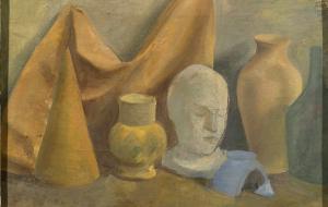 - NOTIZIE STORICO CRITICHE Allievo di Contardo Barbieri per la pittura e di Gianni Remuzzi per la scultura. L'opera è al verso della tela di Ragazza con vaso. Il tema è molto diverso, si passa da un ritratto alla natura morta, ma il clima di sospensione e attesa è identico. In quest'opera dichiaratamente metafisica, in cui si inseriscono tra i vasi e la bottiglia figure geometriche e sculture essenziali, simili a manichini, Manini dimostra la conoscenza soprattutto dei dipinti di Morandi.