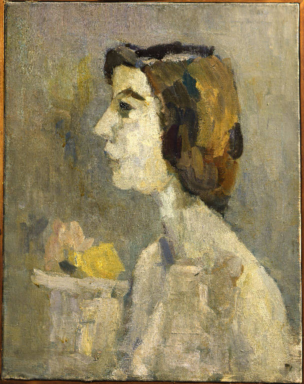 - NOTIZIE STORICO CRITICHE Allievo di Achille Funi e Trento Longaretti. Termina la propria formazione con Luigi Spazzapan a Modena. Proprio intorno alla metà degli anni Cinquanta l'artista è particolarmente vivace nella produzione di ritratti e studi di figura, cui appartiene anche questa piccola tela, nella quale il disegno ha perso completamente la propria valenza a vantaggio di una corposa pennellata, longarettiana, che costruisce la figura, la fa emergere dal fondo, dal quale si stacca completamente solo per la vivace chioma di capelli.