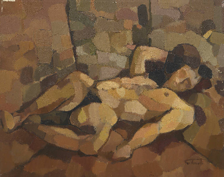 - NOTIZIE STORICO CRITICHE Allievo di Trento Longaretti. Nel 1968 Versetti aveva realizzato la Testa di donna schedata al numero 06EL00170. Questo nudo femminile, inevitabile prova didattica per gli allievi dell'accademia, ha la particolarità di essere costruito per accostamento di campiture di colore, come tessere di mosaico, che delineano il corpo della modella e il fondale. Si tratta di un'interpretazione senz'altro originale, che non ha eguali in ambito accademico bergamasco, realizzata in una fase artistica internazionale, in cui il corpo diventa assoluto protagonista con la Body Art e le performance atte a indagarne le possibilità creative, senza più il filtro della tela o della pietra.