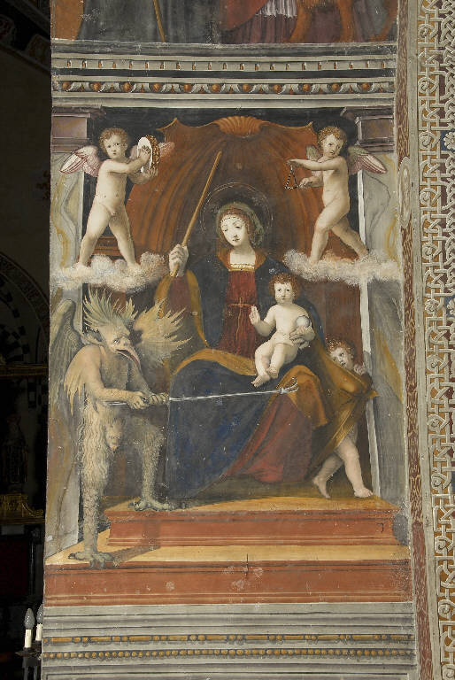 Madonna del "cifulett del cunvent". MADONNA CON BAMBINO IN TRONO CHE COMBATTE IL DIAVOLO