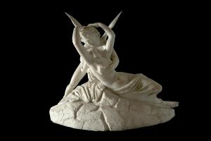 Gruppo scultoreo in marmo bianco rappresentante una figura maschile alata inginocchiata, Amore, e una figura femminile nuda distesa, Psiche, colti nell'atto di abbracciarsi dopo un bacio.