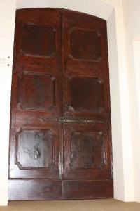 Porta centinata a due battenti con sei specchiature mistilinee definite da cornici; alto zoccolo e grosso catenaccio nella parte mediana.