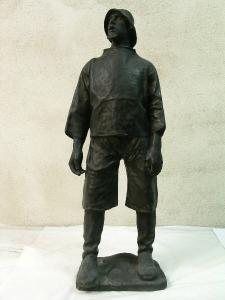 Statua raffigurante figura maschile stante con cappello in testa. Le braccia sono distese lungo il corpo, la gamba destra è leggermente spostata in avanti. Porta ai piedi degli stivali.