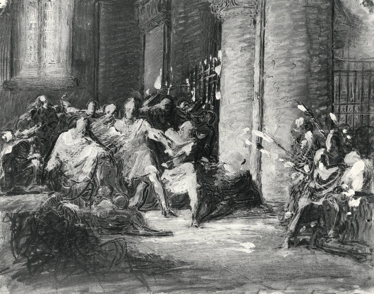 - NOTIZIE STORICO CRITICHE Con il titolo "Rivolta" il dipinto fu esposto alla mostra dedicata all'artista nel 1950, ma si tratta, come già indicato dal Maiocchi, di uno studio preparatorio per il dipinto "La madre di Ricciardino Langosco in traccia del cadavere del figlio ucciso nella espugnazione di Pavia per le armi di Matteo Visconti l'anno 1315"