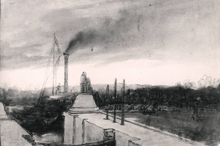 Imbarco al confluente del Ticino dei volontari pavesi accorrenti alla difesa di Venezia. Paesaggio