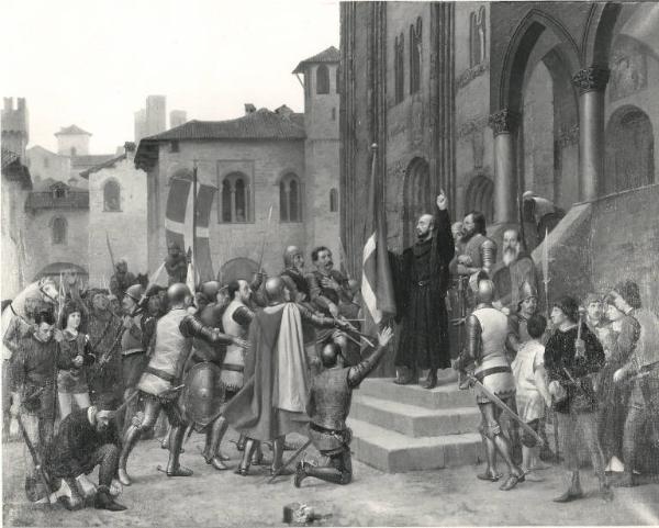 Fra Jacopo Bossolaro che fa giurare ai pavesi fedeltà al vessillo della città. Fra Jacopo Bossolaro che fa giurare ai pavesi fedeltà al vessillo della città