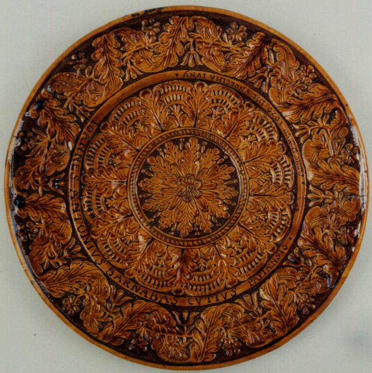 Grande piatto in ceramica ingobbiata e con vetrina bruno rossiccia graffita a punta e a stecca su fondo ribassato.