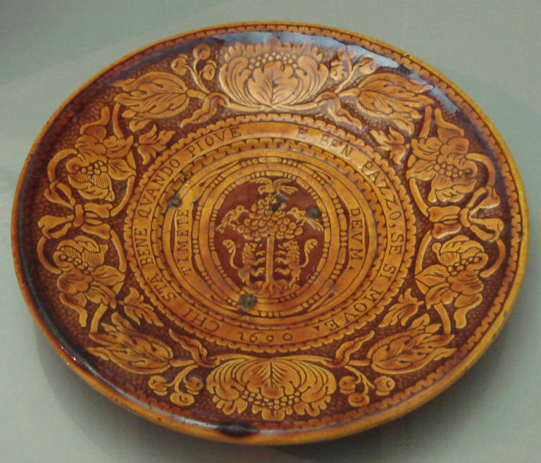 - NOTIZIE STORICO CRITICHE Si tratta di produzione pavese. A lungo si è dibattuto sull'esistenza di una fornace Cuzio, ma ormai è dato per certo che A.M. Cuzio si dilettasse ad eseguire questi straordinari piatti graffiti presso qualche fornace attiva in città. D'altronde sono documentate in città ed in Borgo Ticino numerose fornaci sia laterizie che da maiolica. I piatti 'Cuzio' inoltre rappresentano gli ultimi esiti della grande tradizione della graffita monocroma bruna che a Pavia trova largo sviluppo fino a tutto il XVII secolo.\nIl bordo di questo esemplare decorato con una bordura graffita a fiori è del tutto simile a quelle utilizzate su maiolica 'latesina' a rilievo, prodotte dalle fornaci Imbres e Rampini di Pavia.\nLo stemma araldico è molto simile a quello della nobile famiglia Cucchi, preso a modello da A.M. Cuzio per omonimia quando diviene protonotario del Capitolo della Cattedrale di Pavia.