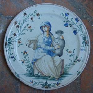 - NOTIZIE STORICO CRITICHE Il piatto è stato prodotto da fornace pavese. A partire dalla seconda metà del XVII secolo fino alla metà del XVIII, Pavia conosce un forte sviluppo della produzione di maiolica di qualità. I due impianti ceramici più importanti sono quello di Carlo Giuseppe Rampini, in Borgo Ticino, e quello della famiglia Imbres sul Lungoticino in Parr. Santa Maria Corte Cremona. La forma del piatto foggiato a stampo e l'uso di un impasto ceramico molto sottile ('latesino') riconducono alla produzione pavese. La presenza di cespi fioriti al bordo con i 'fioretti' in rosso ferro e blu nonchè la figura e la fisionomia della donna raffigurata con un grande vaso riportano senza ombra di dubbio alla produzione ceramica pavese.