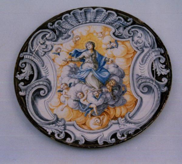 - NOTIZIE STORICO CRITICHE Il piatto è marcato sul retro con 'AF', palma, croce e corona, marca di fabbrica pavese e attribuito al pittore di maioliche Siro Antonio Africa, attivo alternativamente per la fornace Rampini e la Imbres, le due più importanti fornaci pavesi del periodo.