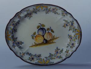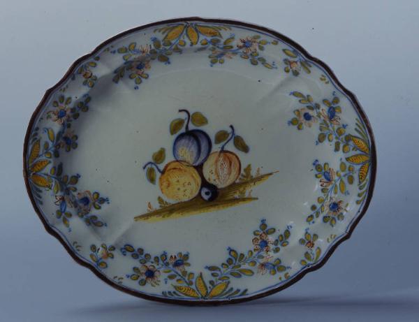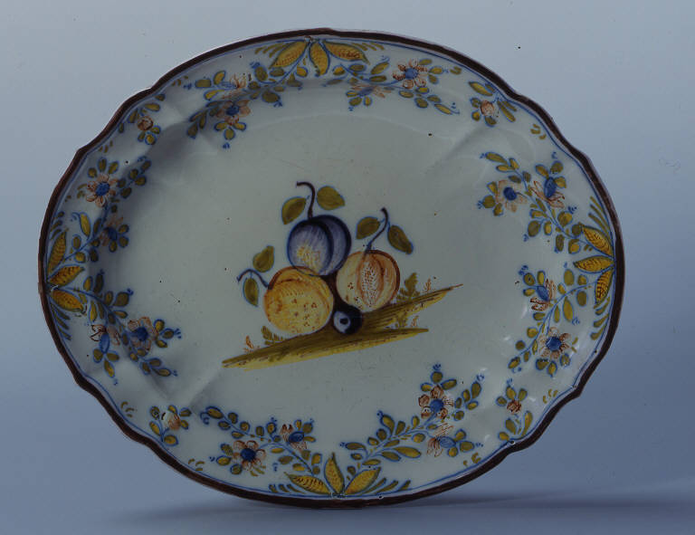 Piiatto ovale mistilineo sagomato e costolato in maiolica con decorazione 'alla frutta' al centro del cavetto, intorno rami fioriti Bordo profilato in bruno di manganese