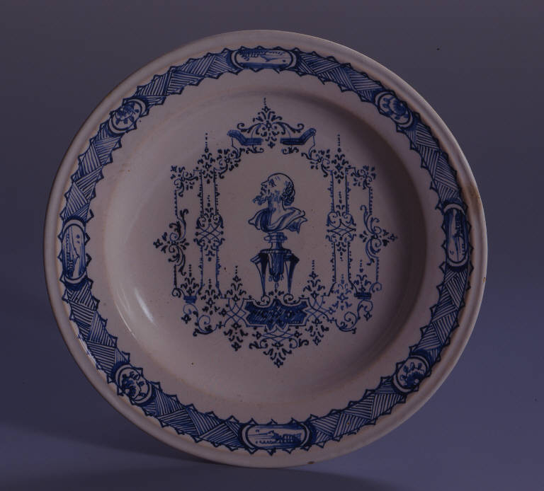 Piatto tondo a bordo liscio con breve tesa piatta e leggero cavetto in maiolica decorata in monocromia blu su smalto bianco