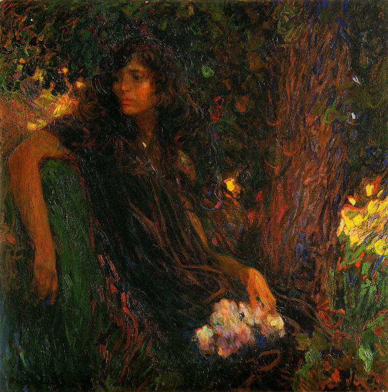 - NOTIZIE STORICO CRITICHE Il dipinto è stato identificato con l'opera intitolata Lucilla, grazie alla segnalazione di Barbara Eleonora Nomellini. La tela con tale titolo è ascritta al numero 20 del catalogo della XII Biennale veneziana del 1920, dove venne allestita una mostra personale del pittore di quarantatre opere. Il quadro dovette cambiare il titolo nei vari passaggi di mercato, poiché venne acquistato con il titolo di La Ninina dai coniugi Moroni. L'opera è databile intorno agli anni Venti, appare, infatti, vicina per spirito e tecnica a dipinti realizzati intorno a quegli anni, come Fra sole e luna o I peschi fioriti, entrambi esposti alla medesima Biennale. In quest'opera, si nota l'intensificarsi della pennellata, carica cromaticamente e materica, al limite del gestuale. Il dolcissimo volto di Lucilla, enigmatico e distante come un ritratto simbolista di Klimt o di Khnopff, e l'intera figura paiono un tutt'uno con la natura avvolgente e protagonista, in una commistione totale. Nomellini seppe inserire nella sua personale evoluzione artistica echi simbolisti e liberty, che si colgono nella tecnica ritmica e sinuosa e nelle gamme cromatiche, al limite dell'espressionismo.