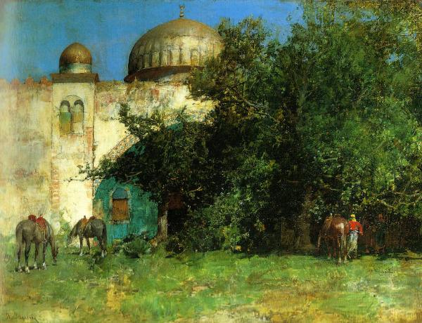 Moschea araba nel paesaggio, con accanto uomini e cavalli