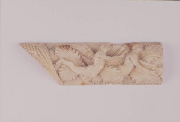 Frammento decorativo, a forma di spicchio, con decorazione intagliata a fogliami stilizzati e figure ignude e alate. Il retro rivela una superficie piuttosto spugnosa.