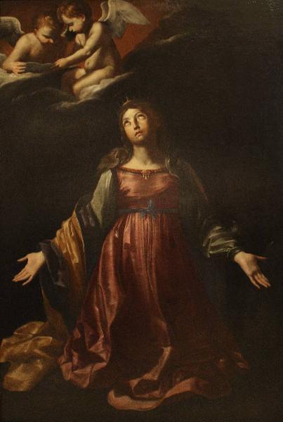 Il dipinto raffigura, secondo un'iconografia usuale ma semplificata, il martirio di santa Caterina, avvenuto per decapitazione fuori dalle mura di Alessandria d'Egitto tra il III e il IV secolo. La santa è rappresentata quale una bella ed elegante giovinetta con la fronte cinta da corona, vestita con ricchi abiti dalle stoffe seriche, che in ginocchio, con le braccia aperte, rivolge lo sguardo supplice al cielo, mentre due angiolotti, assisi sulle nubi, leggono..??. Il fondo è scuro e indistinto e non si leggono gli attributi tradizionali- la ruota spezzata dalla spada dell'angelo durante le torture, la spada brandita dal carnefice e la palma del martirio- così come non compare il gran manto nel quale il corpo della santa verrà avvolto per essere trasportato sul monte Sinai, laddove per volontà di Giustiniano nel 527 sarà fondato un grande monastero in suo onore." Quello della martire Caterina è stato uno dei culti più discussi del pontificato di Clemente VIII, oggetto di revisione severa che contestava alla tradizionale versione della Leggenda Aurea il supplizio finale della ruota dentata, da sostituire invece con la morte per decapitazione "(\nIl riferimento iconografico e stilistico di questo bella e grande pala è da riconoscersi nelle invenzioni pittoriche di Guido Reni, e in