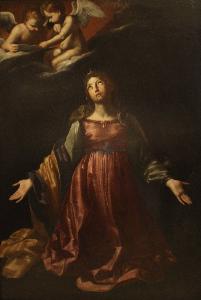 - NOTIZIE STORICO CRITICHE Il riferimento iconografico e stilistico di questo bella e grande pala è da riconoscersi nelle invenzioni pittoriche di Guido Reni, e in particolare nel quadro omonimo realizzato dal grande maestro bolognese intorno al 1606 (ora Albenga, Museo Diocesano), dalla composizione peraltro assai più complessa e articolata - per la presenza del carnefice, in atto di menare il colpo ferale della spada, e dell'angelo recante la palma - e ricca di notazioni d'ambiente. \nIl dipinto pavese era stato venduto ad un'asta Finarte (Roma 1988) quale opera di Francesco Gessi (Bologna 1588- 1649), un allievo del Reni attivo a Ravenna e a Perugia oltre che nella Certosa di Bologna, a proposito del quale la critica aveva sottolineato rapporti con il maestro più di collaborazione dialettica che di stretta dipendenza. Ricordata con la medesima attribuzione presso la collezione Mario Bigetti di Roma, la pala era poi stata riconosciuta quale opera di Gian Giacomo Sementi, discepolo anch'egli di Guido Reni, che a partire dal 1626 aveva realizzato numerose e fedeli copie dagli originali del maestro, talora con qualche intervento pittorico di ritocco e miglioria da parte del maestro medesimo: richiama il linguaggio del Sementi la costruzione dei personaggi attraverso la resa volumetrica dei panneggi e l'accuratezza degli effetti luminosi dei tessuti.