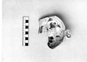 - NOTIZIE STORICO CRITICHE Proviene dagli scavi stratigrafici all'interno della Torre Civica di Pavia (1972-3) (cfr. H. Blake, Scavo nella Torre Civica di Pavia, 1972 in Archeologia Medievale, I, 1974). Il motivo decorativo è diffuso in area settentrionale, Liguria, Romagna, Veneto. Reca iscrizione M.I. sotto al piede.