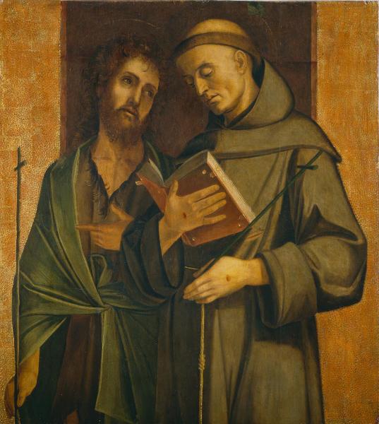 Coppia di santi. A sinistra San Giovanni Battista con la classica veste eremitica e un manto verde annodato. La mano indica verso la sua destra, dove si trova San Francesco con in mano un libro rosso e una croce. Ben visibili le stimmate sulle mani.