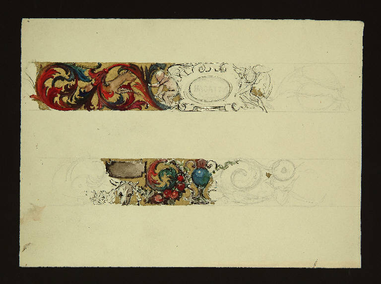 Due fasce decorative con motivi a girali, putti e figure antropomofe e schizzi a matita sul verso
