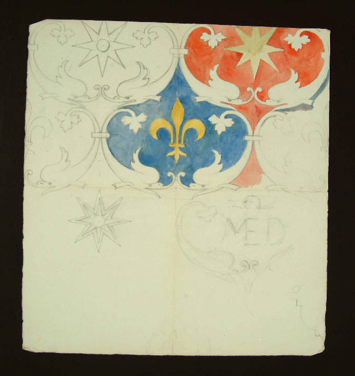 Particolari di motivi decorativi con elemento zoomorfe, il giglio simbolo della Famiglia Bagatti, e la stella.