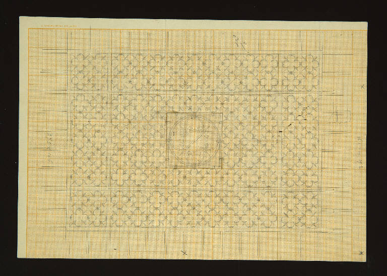Studio didecorazione per cancello con motivo quadrilobato e raggia punzone. Al centro particolare del quadrilobato in un cerchio dcorato con foglie inserito in un cerchio. Indicazioni di misure ai lati del disegno e sul verso. Schizzo di elemento architettonico sul verso.