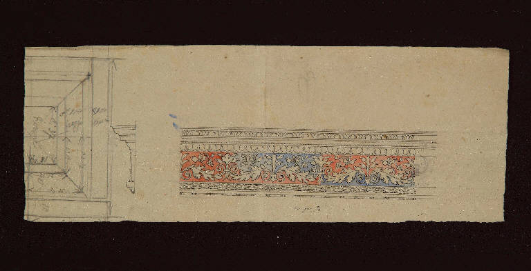 fregio disegnato a matita, ripassato a penna e acquerellato in rosso e blu; a sinistra, visto in sezione; all'estrema sinistra, schema per la collocazione di un rosone, del fregio e di una "treccia", con numeri utili alle misure