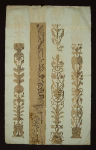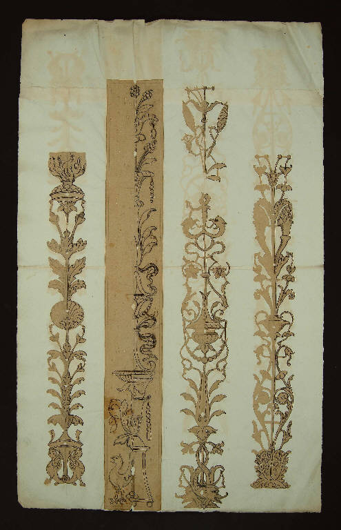 Cartoncino beige che porta il disegno ritagliato e sagomato e incollato su carta bianca, fascia superiore di cartoncino aggiunta