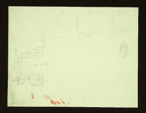macchie di acquerello rosso, sul verso schizzo architettonico