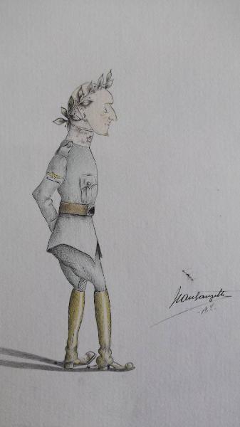 - NOTIZIE STORICO CRITICHE Gabriele D'Annunzio è raffigurato con indosso la divisa dei Lancieri di Novara 5, il braccio destro ferito e il fregio dei piloti dell'aviazione. Alla vita porta un cinturone modello14.\nNelle Civiche Raccolte Storiche è conservato anche il disegno preparatorio (Cart. 495, pl. IX.1).\nIn guerra D'Annunzio fu protagonista di imprese audaci e spettacolari fra le quali la Beffa di Buccari e il Volo su Vienna rispettivamente del febbraio e agosto 1918, incarnando così il mito del "Superuomo".\nQui viene raffigurato con il colletto dell'uniforme decorato con le "fiamme" del V Reggimento dei Lancieri di Novara, il distintivo di una ferita di guerra e il fregio d'Osservatore d'Aviazione\nal braccio destro. \nMausanzetta era solito realizzare anche piccoli disegni a grafite su carta aventi come soggetto gli stessi motivi delle caricature: in questi bozzetti, dei quali non è stato ancora individuato lo scopo finale, non manca l'attenzione al dettaglio e al particolare.