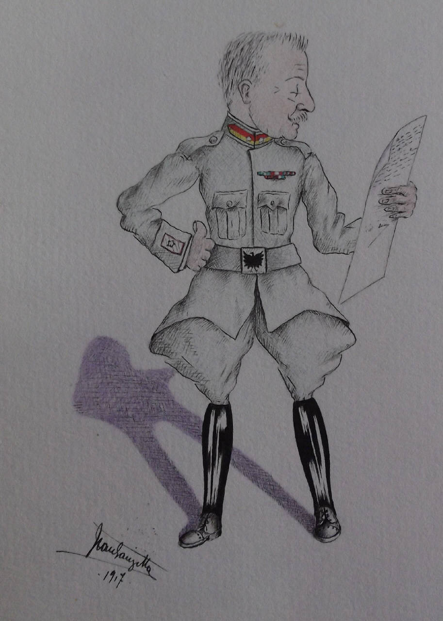 - NOTIZIE STORICO CRITICHE Maggiore generale Alessandro Tagliaferri, Comandante della brigata "Bari" 139-140 RF dal 24 maggio al 3 agosto 1917.Grazie alla precisione di rappresentazione grafica dei gradi, tipica dell'artista, l'analisi uniformologica, confrontata con il Diario di Guerra di Brigata, ha permesso di identificare il soggetto nel Maggiore Generale Alessandro Tagliaferri, Comandante della Brigata Bari dal 24 maggio al 3 agosto 1917, identità confermata dall'iscrizione