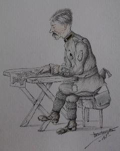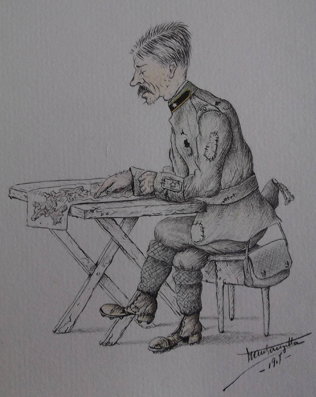 - NOTIZIE STORICO CRITICHE Angelo Fiorito (n. 1877) indossa una giubba da truppa riconoscibile dal "salsicciotto" cucito sulla spalla, recante il numero del reggimento "70". L'artista, in realtà, avrebbe dovuto disegnare il numero "3", indicante la compagnia. Inoltre, porta la fondina della pistola d'ordinanza Bodeo, modello 1889 e si intravvede quello che resta del cordino utile a non perderla.\nNella descrizione del personaggio Mausanzetta compie qui alcuni errori: disegna sul colletto le mostrine con i colori della Brigata Ancona mancanti di alcuni particolari; sulla spalla sinistra segna il numero del Reggimento al posto di quello del Battaglione (III), come da disposizione uniformologica. \nIl Comandante Luigi Fiorito indossa la giubba da truppa e la fondina della pistola d'ordinanza Bodeo modello 1889. Ufficiale sempre in prima linea, cadde il 26 ottobre 1917 sul Monte Faiti (Carso), meritando una Medaglia d'Argento. Mausanzetta sottolinea la sua temerarietà ritraendolo con la divisa usurata dal combattimento