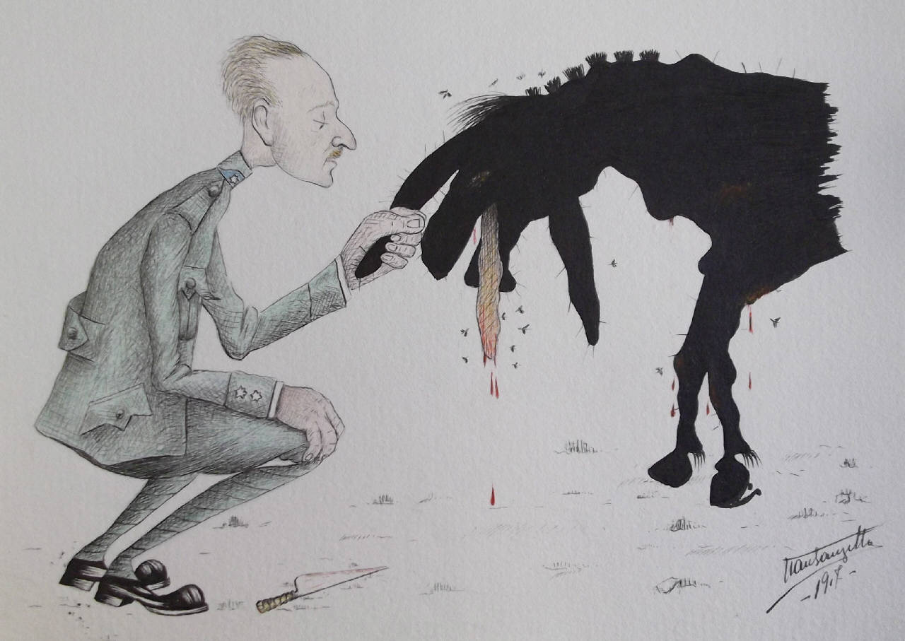 - NOTIZIE STORICO CRITICHE Dell'Ufficiale non si è trovata nessuna indicazione; la posa caricaturale ritrae un mulo fiaccato, ammalato e azzoppato, poco prima di essere soppresso dall'Ufficiale Veterinario, qualifica ribadita dalle "pipe" celesti identificative del Corpo poste sul colletto.